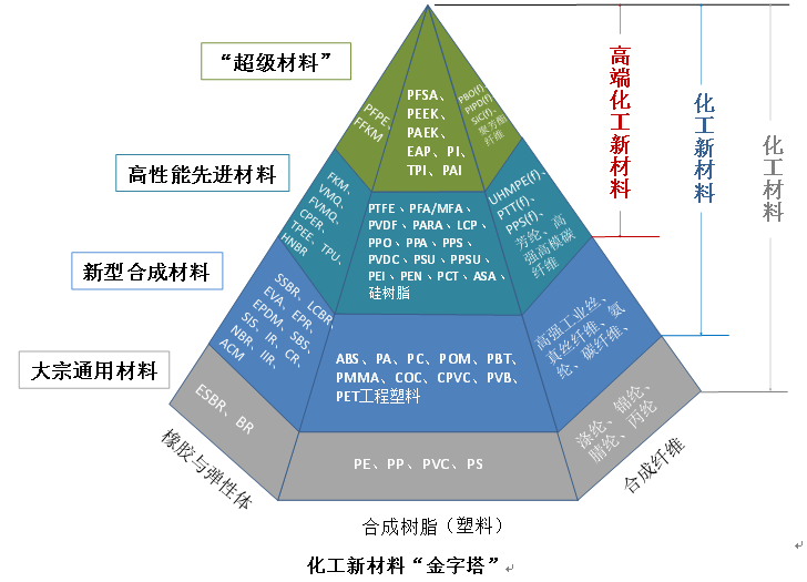 新材料產業是推進《中國制造2025》要優先發展兩個核心基礎產業之一,而化工新材料產業在新材料產業中占據主要地位。化工新材料已成為化工行業轉型升級的主要方向和增長的主要動力,我國化工新材料產業正處在由“金字塔”底層向中上層邁進的關鍵時期。緊密跟蹤性能好、技術新、價值高的產品,特別是“金字塔”中上部的新材料產品,是未來十年捕捉產業發展先機的關鍵。