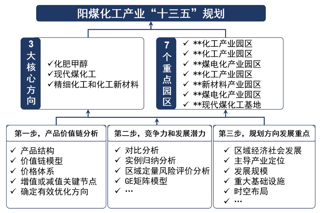 陽煤集團(tuán)化工產(chǎn)業(yè)的發(fā)展歷程是我國傳統(tǒng)煤化工的典型代表,既有復(fù)雜歷史又有新增內(nèi)容,導(dǎo)致形成新老并存、良莠不齊的現(xiàn)狀。針對研究對象的復(fù)雜性,本項(xiàng)目采取了“把脈問診解難題,量體裁衣定規(guī)劃”的方法,采用10+1工作方案,選取陽煤化工3大核心產(chǎn)業(yè)和7個重點(diǎn)園區(qū)進(jìn)行評價診斷,共計10個專項(xiàng)診斷研究,在此基礎(chǔ)上形成陽煤化工產(chǎn)業(yè)“十三五”規(guī)劃,由此形成切合實(shí)際的診斷和規(guī)劃研究。