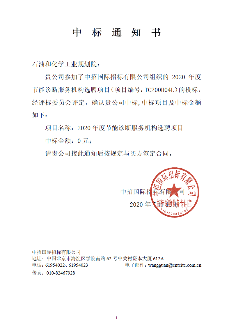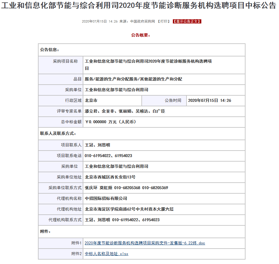7月15日,“工業(yè)和信息化部節(jié)能與綜合利用司2020年度節(jié)能診斷服務(wù)機構(gòu)選聘項目(招標編號:TC200H04L)”中標結(jié)果在中國政府采購網(wǎng)正式公示,石油和化學(xué)工業(yè)規(guī)劃院在激烈的競爭中順利中標,正式成為“2020年度節(jié)能診斷服務(wù)機構(gòu)。