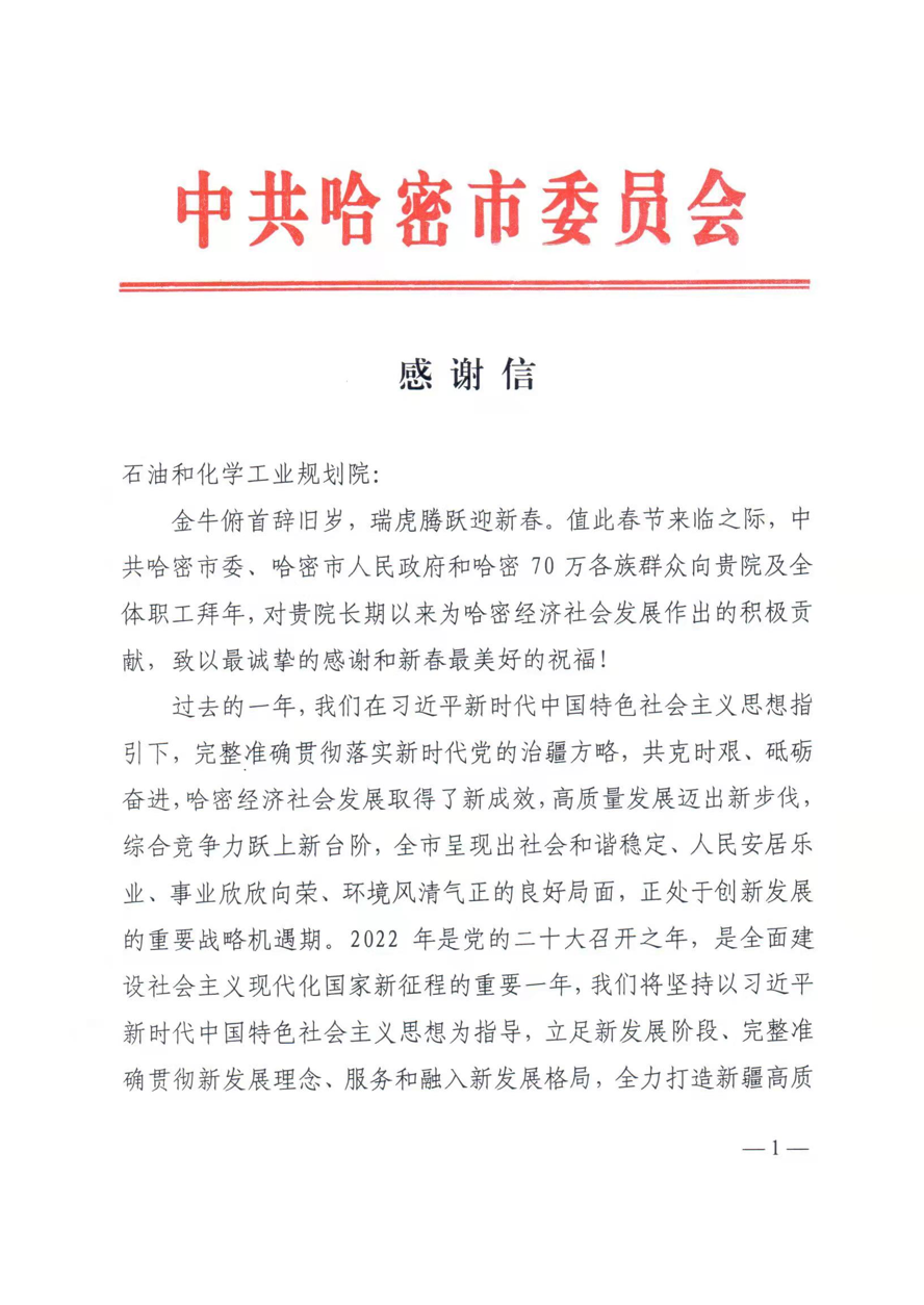 石油和化學(xué)工業(yè)規(guī)劃院與哈密市政府有著長(zhǎng)期良好的合作關(guān)系,為促進(jìn)哈密市石化化工行業(yè)發(fā)展,規(guī)劃院積極為哈密市政府建言獻(xiàn)策,為當(dāng)?shù)鼗@區(qū)和企業(yè)編制產(chǎn)業(yè)規(guī)劃,提供項(xiàng)目建設(shè)方案,推動(dòng)了能源化工產(chǎn)業(yè)高質(zhì)量發(fā)展。哈密市黨委、政府及相關(guān)機(jī)構(gòu)對(duì)我院的技術(shù)支撐工作充分信任、大力支持、高度認(rèn)可。