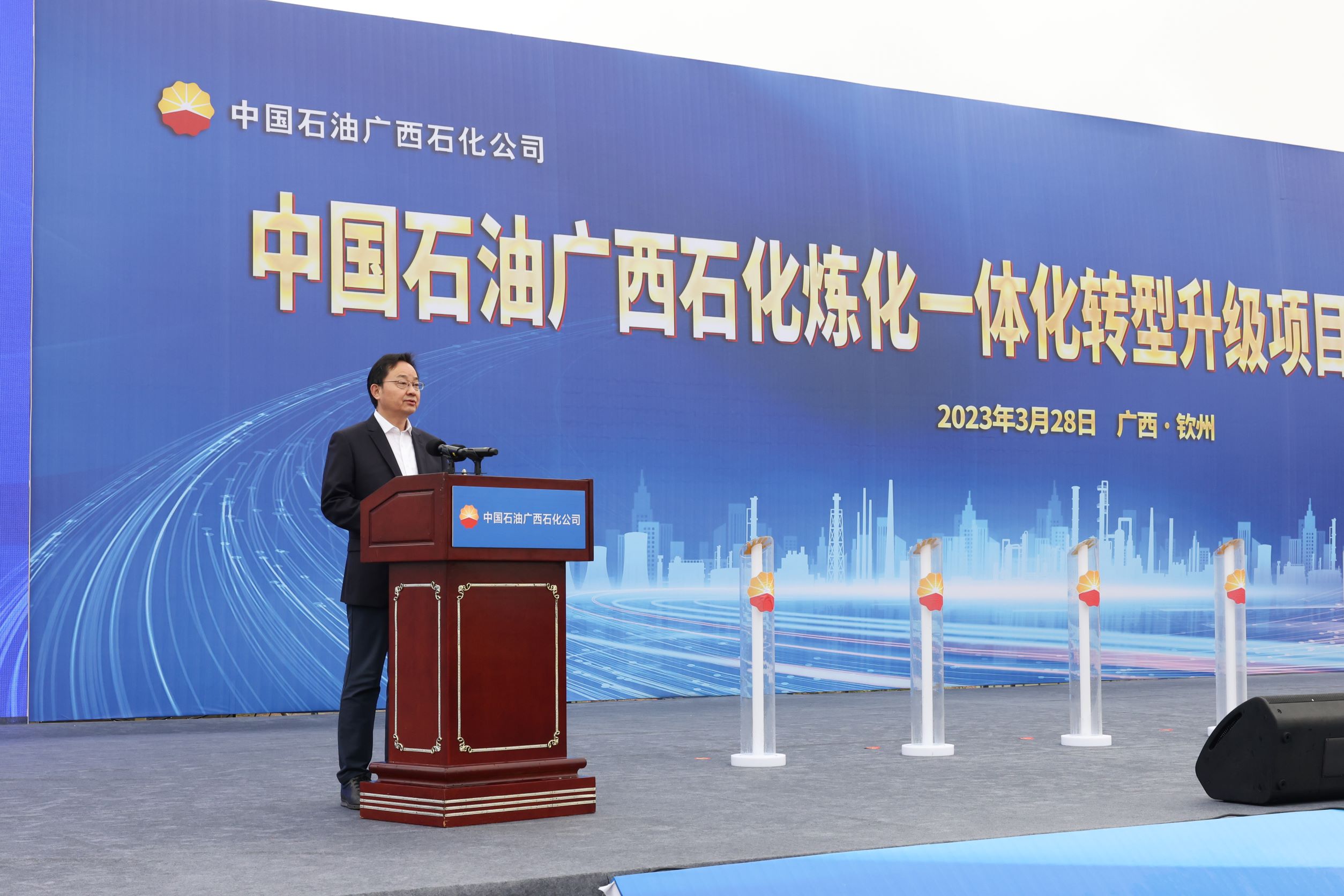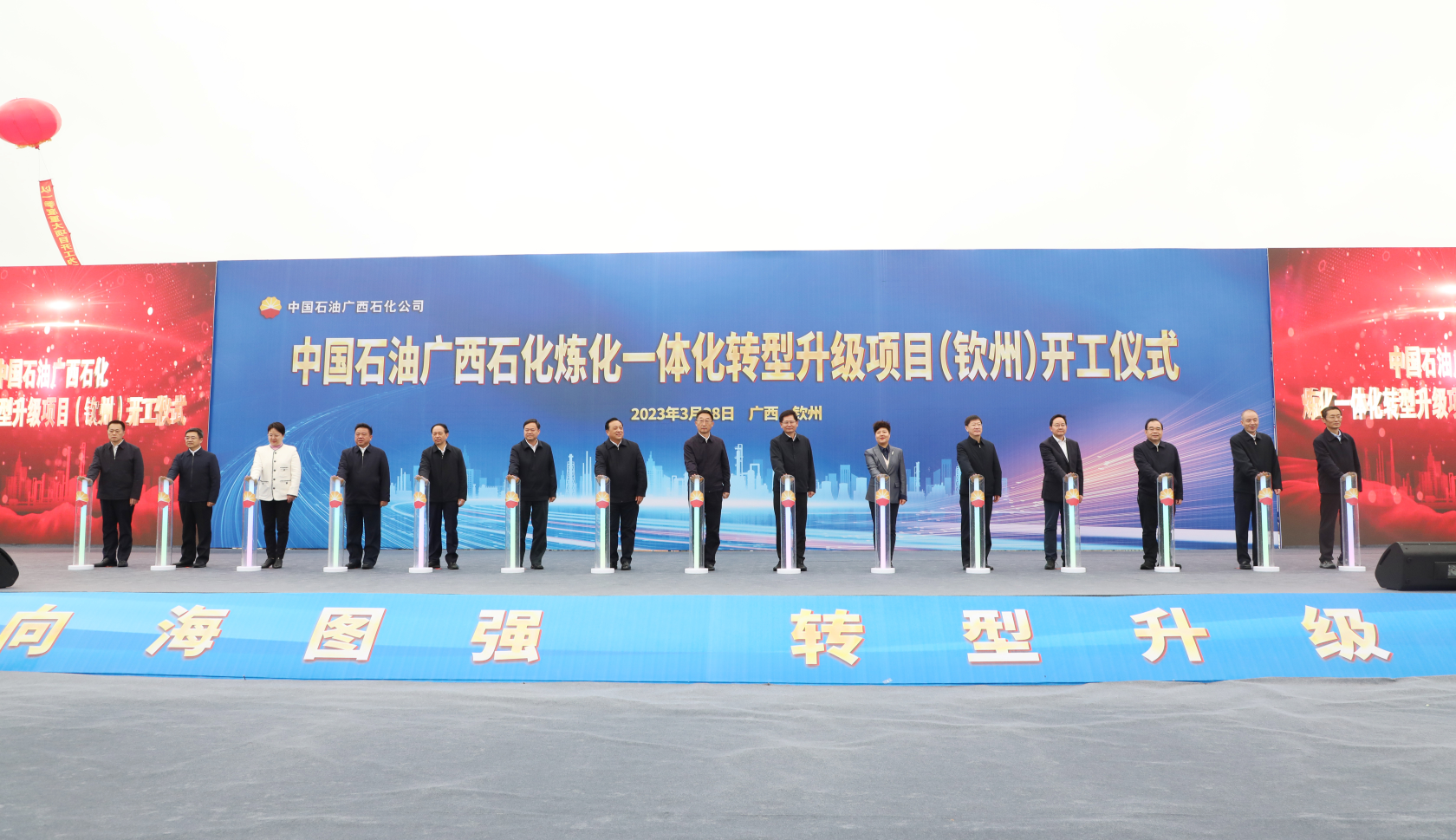 3月28日,中國石油廣西石化煉化一體化轉(zhuǎn)型升級項目和華誼欽州化工新材料一體化基地三期工程甲醇制烯烴及下游深加工一體化項目開工儀式先后在欽州舉行。廣西自治區(qū)黨委書記、自治區(qū)人大常委會主任劉寧,自治區(qū)黨委副書記、自治區(qū)主席藍天立,中國石油天然氣集團總經(jīng)理侯啟軍、上海市人大常委會副主任陳靖等出席項目開工儀式,共同見證項目開工建設(shè)。