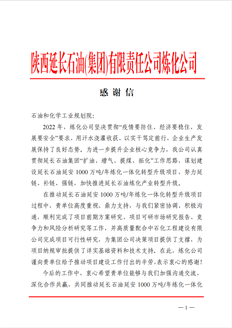石油和化學工業規劃院與陜西延長石油(集團)有限責任公司煉化公司有著長期良好的合作關系,多年來為延長煉化公司的產業結構轉型升級和“十四五”發展謀篇布局,結合國內外煉化行業發展趨勢及國家政策要求,充分調研、認真研究,著力延鏈、補鏈、強鏈,深入分析1000萬噸/年煉化一體化轉型升級項目,為企業高質量發展提供技術支持和建議。未來我院將不忘初心、牢記使命,發揮自身專業優勢,一如既往持續做好相關技術支持工作,貫徹落實相關國家部委的政策措施,促進地方產業經濟高質量發展,協助重點企業與地方對接發展需求,做好政府決策的思想庫、行業發展的引領者、園區建設的顧問隊和企業發展的智囊團。