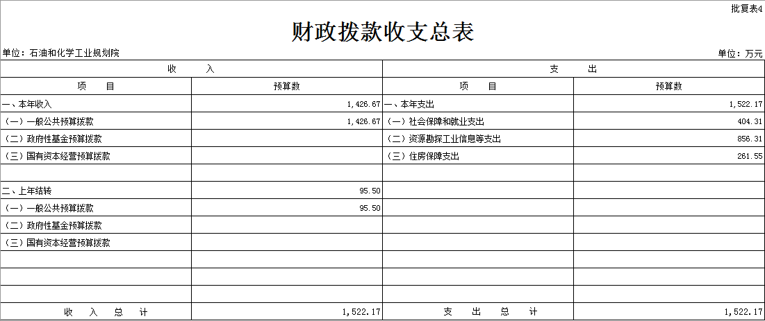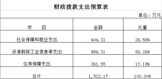 2023年財政撥款收支總預算1522.17萬元。收入包括:一般公共預算撥款1426.67萬元、上年結轉(zhuǎn)95.5萬元;支出包括:社會保障和就業(yè)支出404.31萬元、資源勘探工業(yè)信息等支出856.31萬元、住房保障支出261.55萬元。