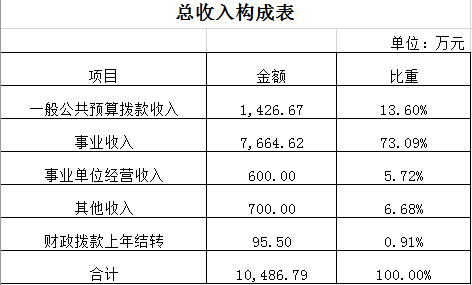 2023年收入預算10486.79萬元,其中上年結轉(zhuǎn)95.5萬元,占0.91%;一般公共預算撥款收入1426.67萬元,占13.6%;事業(yè)收入7664.62萬元,占73.09%;事業(yè)單位經(jīng)營收入600萬元,占5.72%;其他收入700萬元,占6.68%。