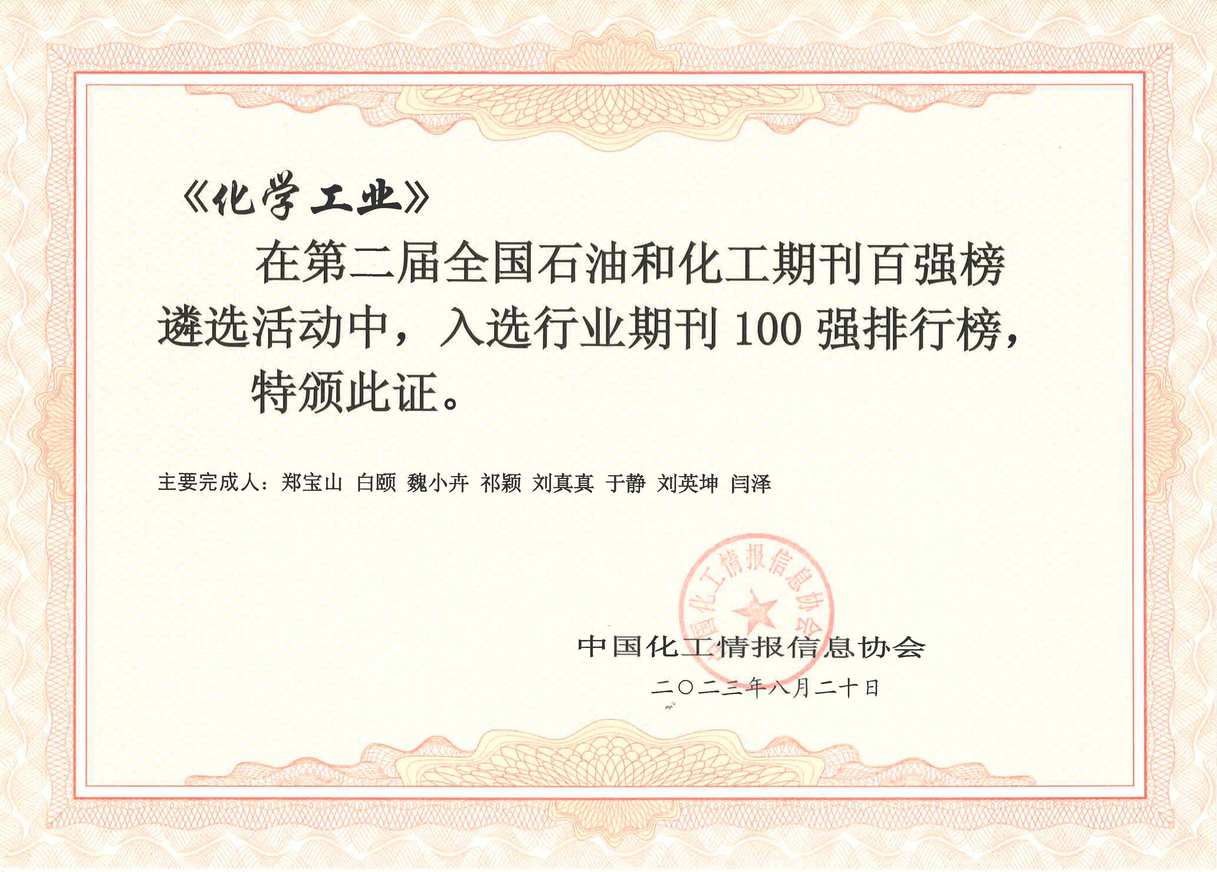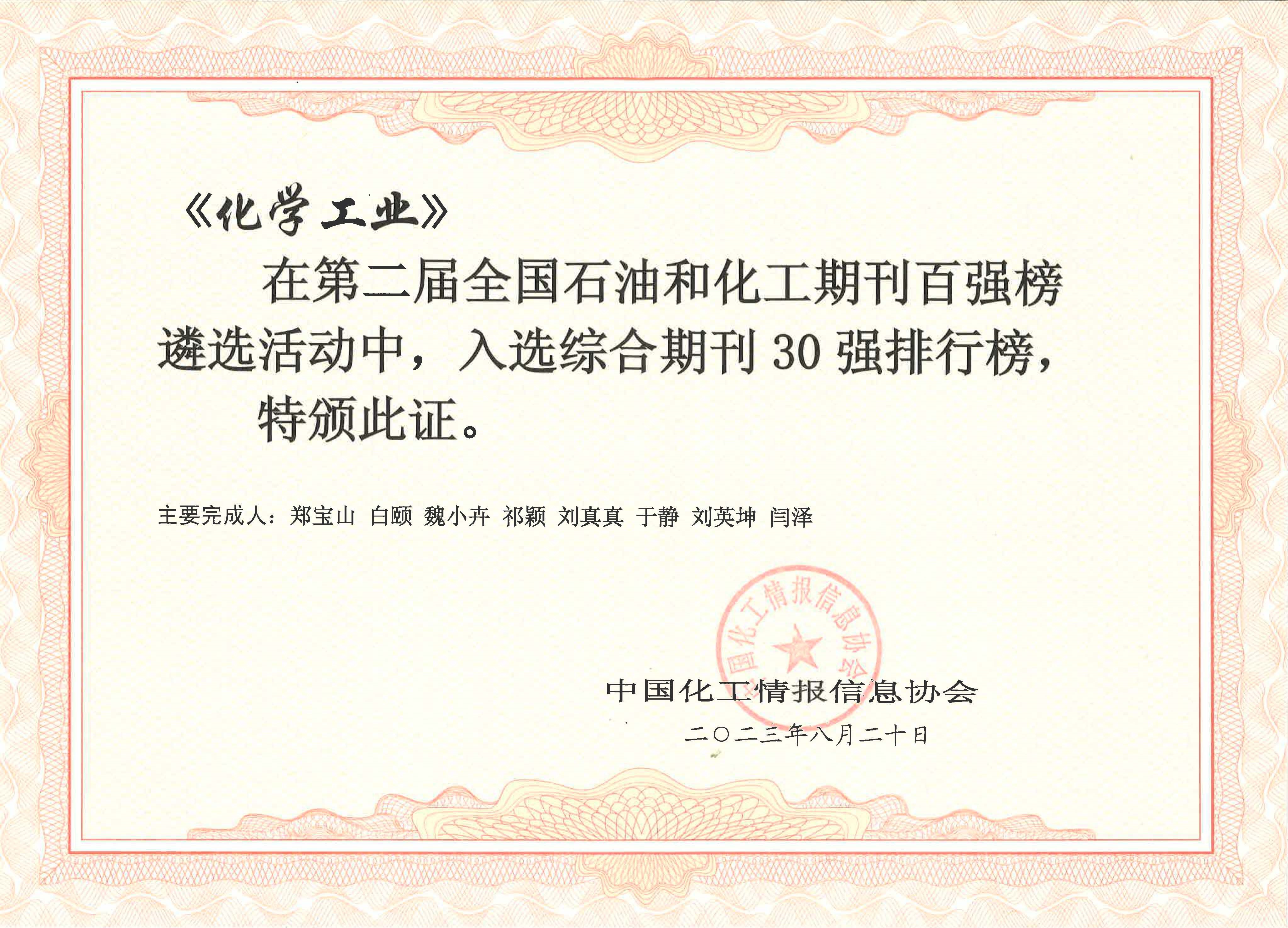 為貫徹落實關于建設世界一流科技期刊的精神,引導石油和化工行業期刊適應媒體數字化、網絡化、市場化發展趨勢,打造行業領軍期刊、品牌期刊,由中國化工情報信息協會與中國化工信息中心、中石油經濟技術研究院共同開展的第二屆全國石油和化工期刊百強排行榜遴選活動近日在浙江寧波發布?!痘瘜W工業》在本次百強榜遴選活動中入選行業期刊100強和綜合期刊30強。