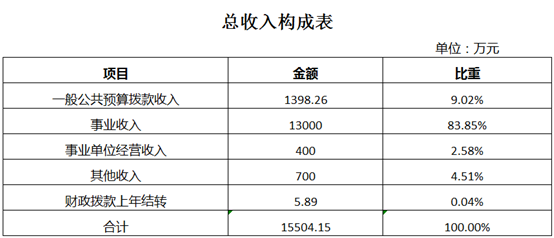 2024年收入預(yù)算15504.15萬(wàn)元,其中上年結(jié)轉(zhuǎn)5.89萬(wàn)元,占0.04%;一般公共預(yù)算撥款收入1398.26萬(wàn)元,占9.02%;事業(yè)收入13000萬(wàn)元,占83.85%;事業(yè)單位經(jīng)營(yíng)收入400萬(wàn)元,占2.58%;其他收入700萬(wàn)元,占4.51%。