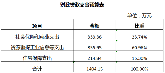 2024年財(cái)政撥款收支總預(yù)算1404.15萬(wàn)元。收入包括:一般公共預(yù)算撥款1398.26萬(wàn)元、上年結(jié)轉(zhuǎn)5.89萬(wàn)元;支出包括:社會(huì)保障和就業(yè)支出333.36萬(wàn)元、資源勘探工業(yè)信息等支出855.95萬(wàn)元、住房保障支出214.84萬(wàn)元。