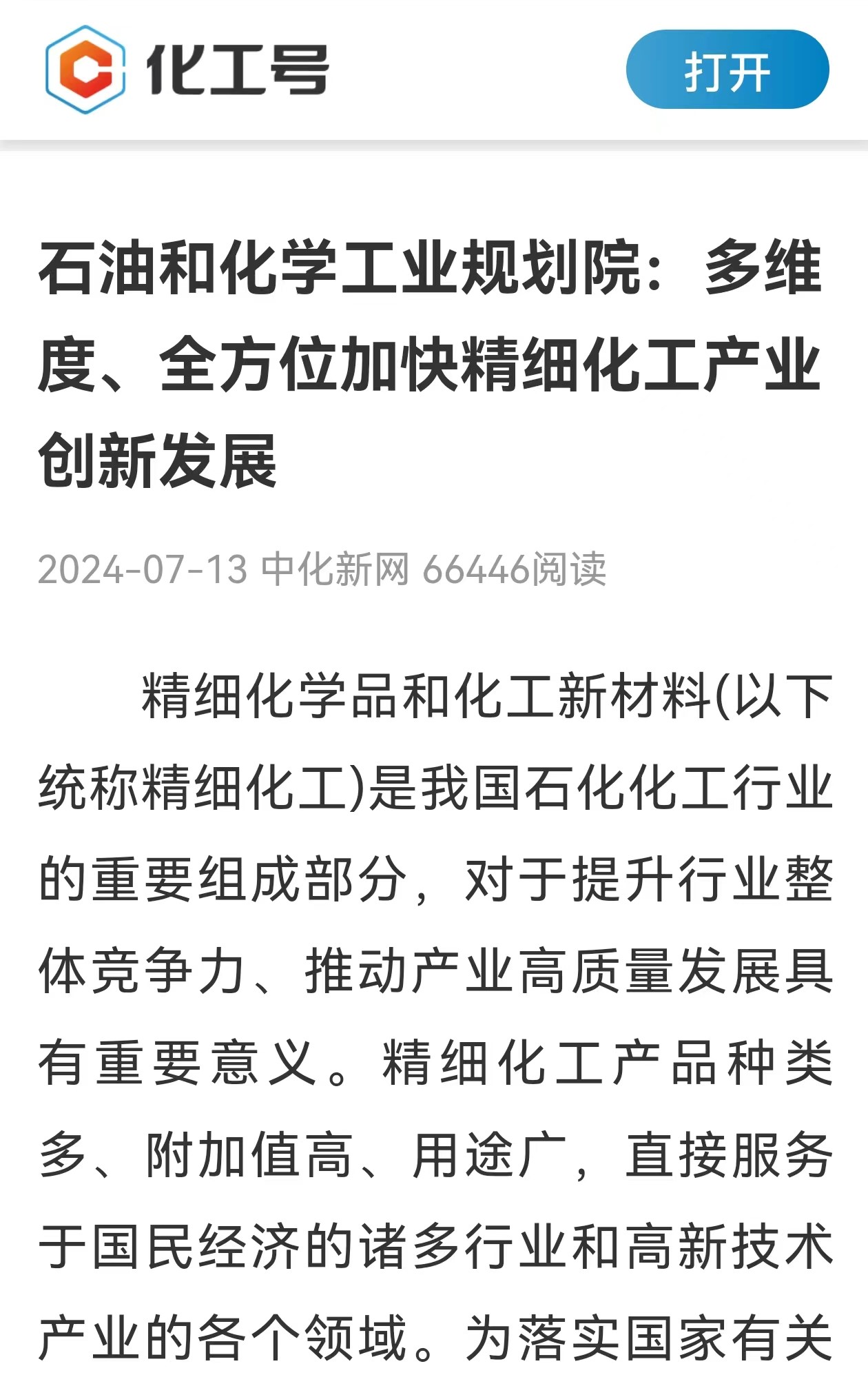 【編者按】7月12日,工業(yè)和信息化部等九部門印發(fā)《精細(xì)化工產(chǎn)業(yè)創(chuàng)新發(fā)展實(shí)施方案》,中央電視臺(tái)財(cái)經(jīng)頻道播報(bào)了新聞。石油和化學(xué)工業(yè)規(guī)劃院作為全程編制參與單位,第一時(shí)間組織編寫(xiě)了解讀文章。一經(jīng)在中化新網(wǎng)發(fā)表,短短一天多時(shí)間,閱讀量就達(dá)到6萬(wàn)多人。
