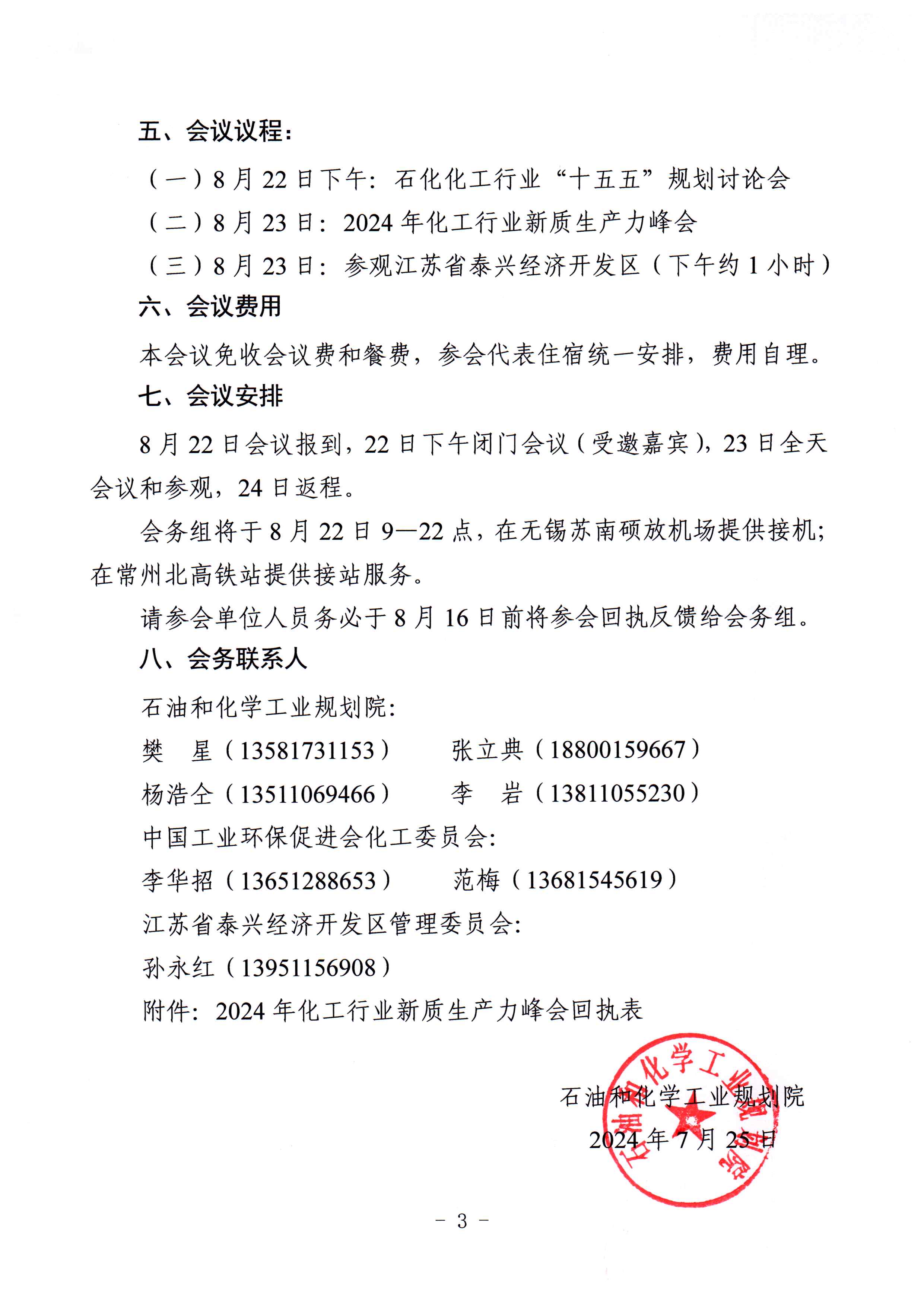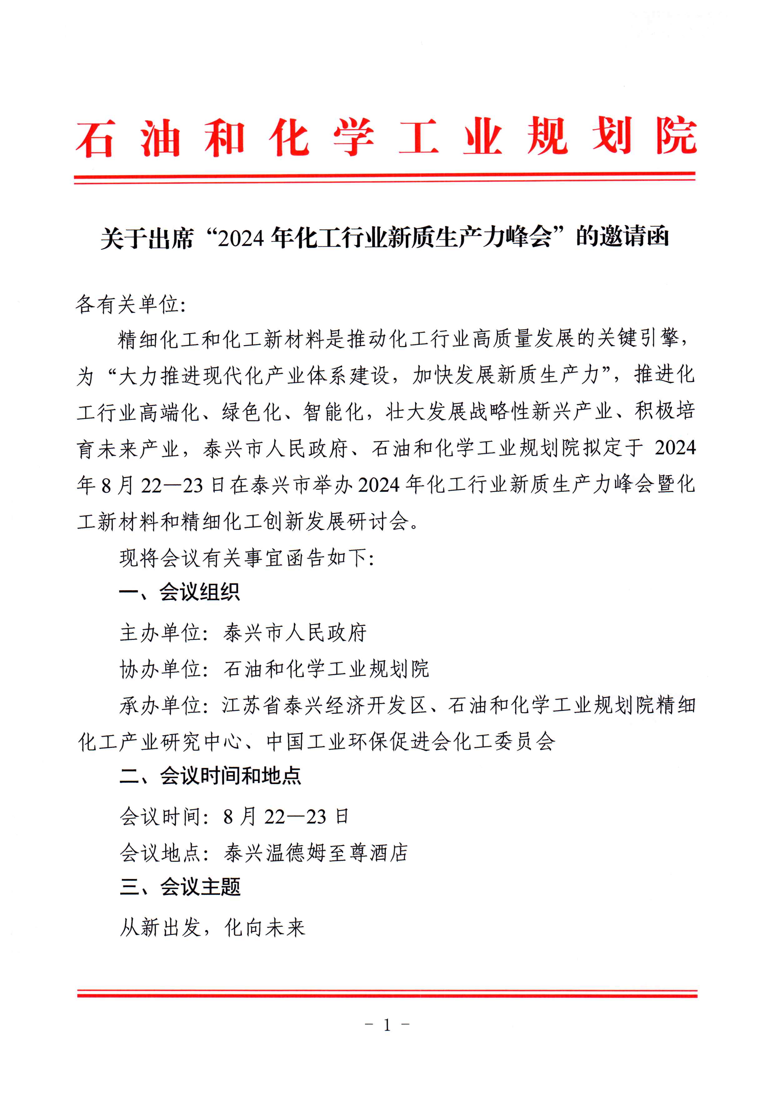 精細化工和化工新材料是推動化工行業(yè)高質(zhì)量發(fā)展的關鍵引擎,為“大力推進現(xiàn)代化產(chǎn)業(yè)體系建設,加快發(fā)展新質(zhì)生產(chǎn)力”,推進化工行業(yè)高端化、綠色化、智能化發(fā)展,壯大發(fā)展戰(zhàn)略性新興產(chǎn)業(yè)、積極培育未來產(chǎn)業(yè),泰興市人民政府、石油和化學工業(yè)規(guī)劃院將于2024年8月22—23日在泰興市舉辦2024年化工行業(yè)新質(zhì)生產(chǎn)力峰會暨化工新材料和精細化工創(chuàng)新發(fā)展研討會。