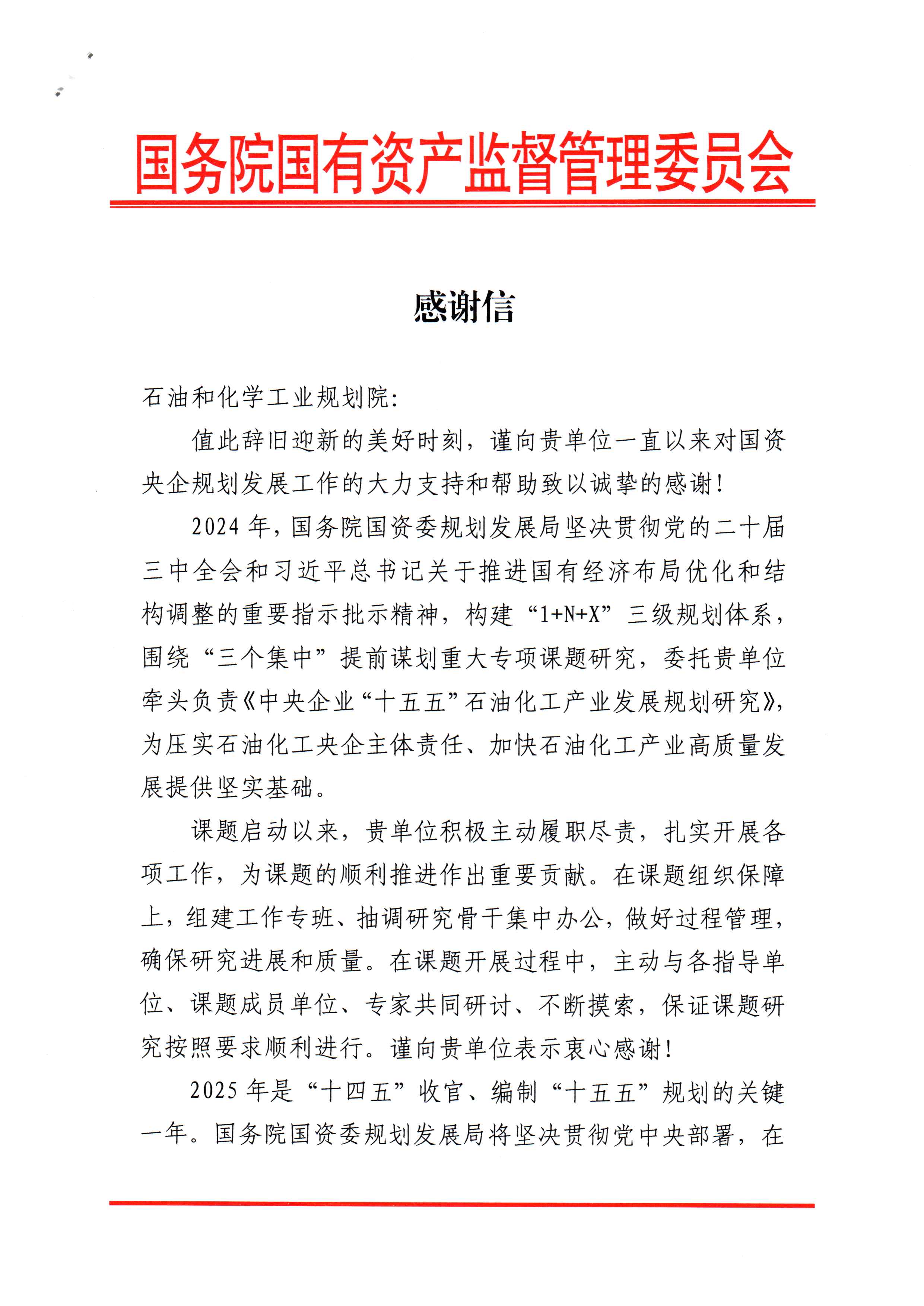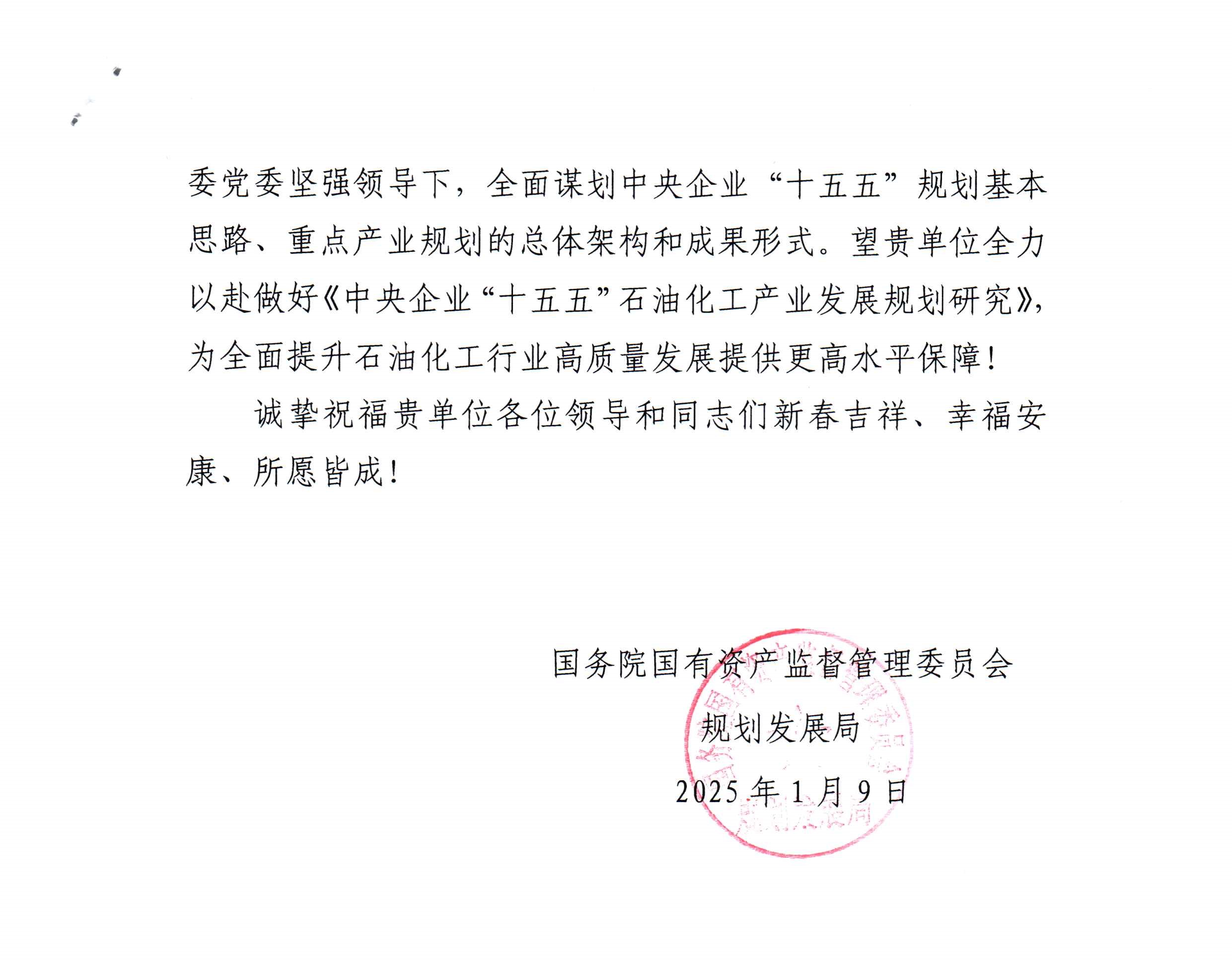 2024年,石油和化學(xué)工業(yè)規(guī)劃院積極發(fā)揮國家智庫的作用,支撐國務(wù)院國資委規(guī)劃發(fā)展局在中央企業(yè)“十五五”石油化工產(chǎn)業(yè)發(fā)展規(guī)劃研究方面開展了一系列工作,獲得了國務(wù)院國資委規(guī)劃發(fā)展局的高度認(rèn)可。