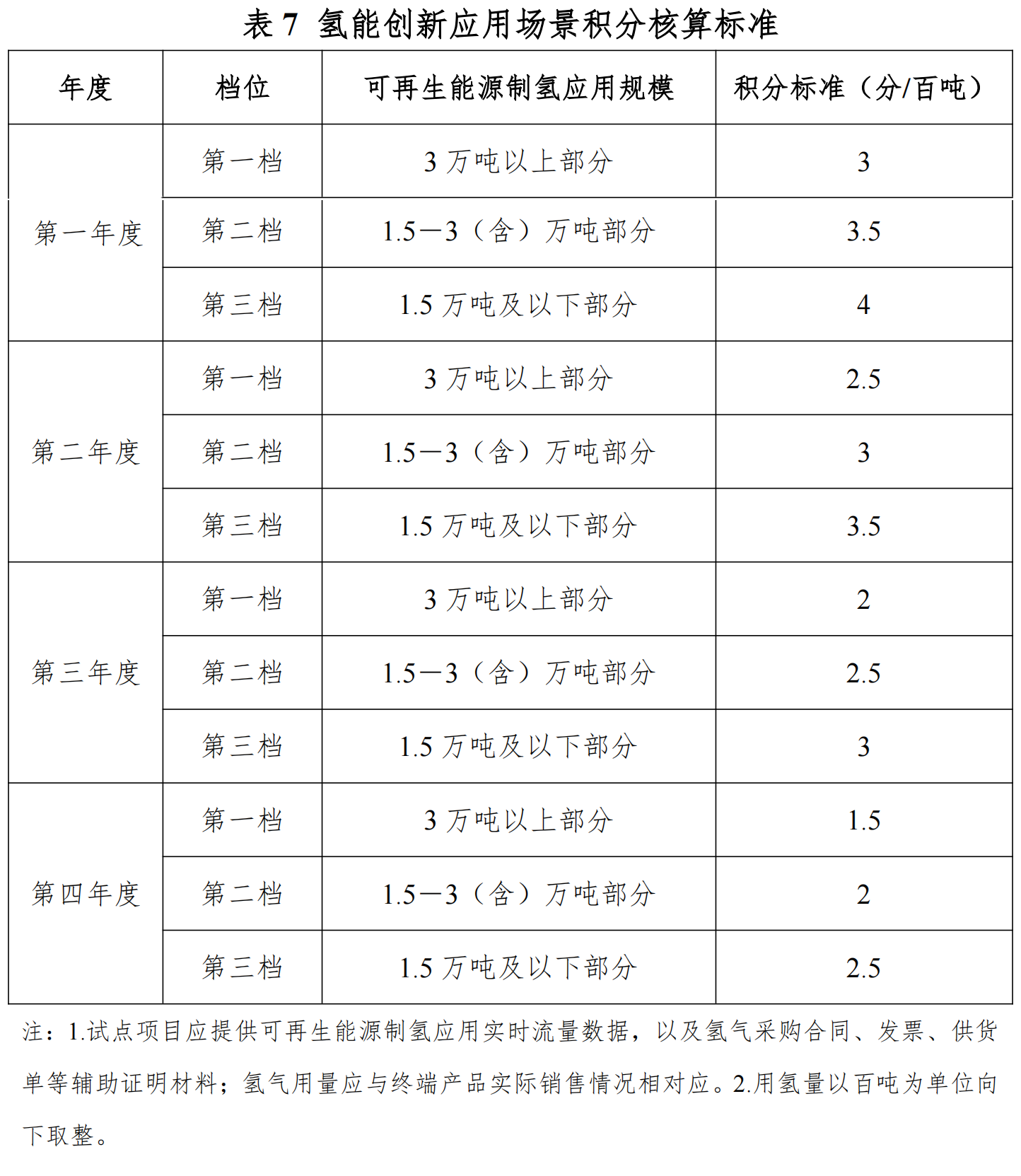 每個試點年度結束后,工業和信息化部、財政部、國家發展改革委將組織開展績效評價,聚焦支持終端產品應用的原則(相關產品均要求在國內生產、銷售和使用),按照燃料電池汽車推廣規模和氫氣加注量,綠色氨醇、氫基化工原料替代、氫冶金、摻氫燃燒及創新應用場景的終端產品應用情況或用氫規模等,核算獎勵積分,原則上1積分獎勵8萬元,通過“以獎代補”方式給予資金獎勵。以燃料電池汽車為主要場景的城市群,應因地制宜布局工業領域應用場景。以工業領域應用為主要場景的城市群,工業領域應用場景占比原則上不低于75%。各應用場景積分核算標準如下: