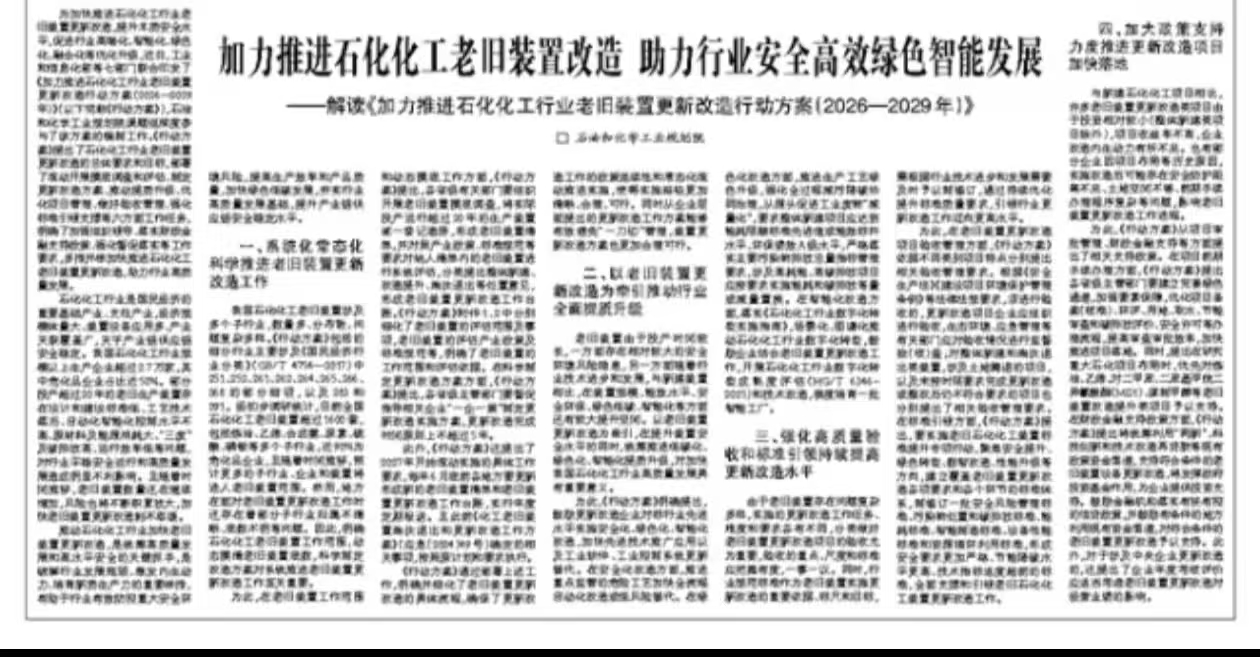 為加快推進石化化工行業老舊裝置更新改造,提升本質安全水平,促進行業高端化、智能化、綠色化、融合化優化升級,近日,工業和信息化部等七部門聯合印發了《加力推進石化化工行業老舊裝置更新改造行動方案(2026—2029年)》(以下簡稱《行動方案》),石油和化學工業規劃院課題組深度參與了該方案的編制工作。《行動方案》提出了石化化工行業老舊裝置更新改造的總體要求和目標,部署了滾動開展摸底調查和評估、制定更新改造方案、推動提質升級、優化項目管理、做好驗收管理、強化標準引領支撐等六方面工作任務,明確了加強組織領導、落實財政金融支持政策、強化督促落實等工作要求,多措并舉加快推進石化化工老舊裝置更新改造,助力行業高質量發展。
