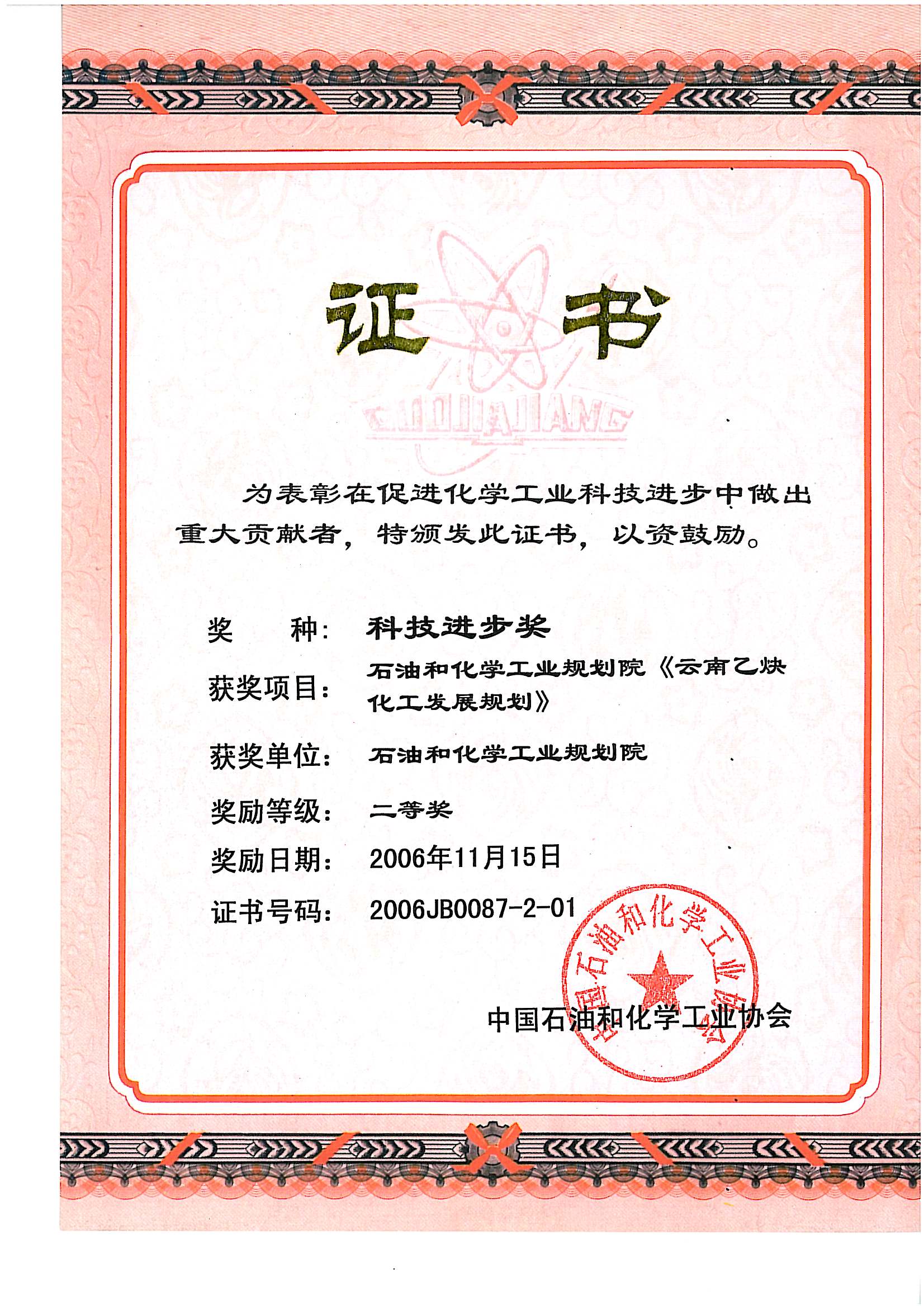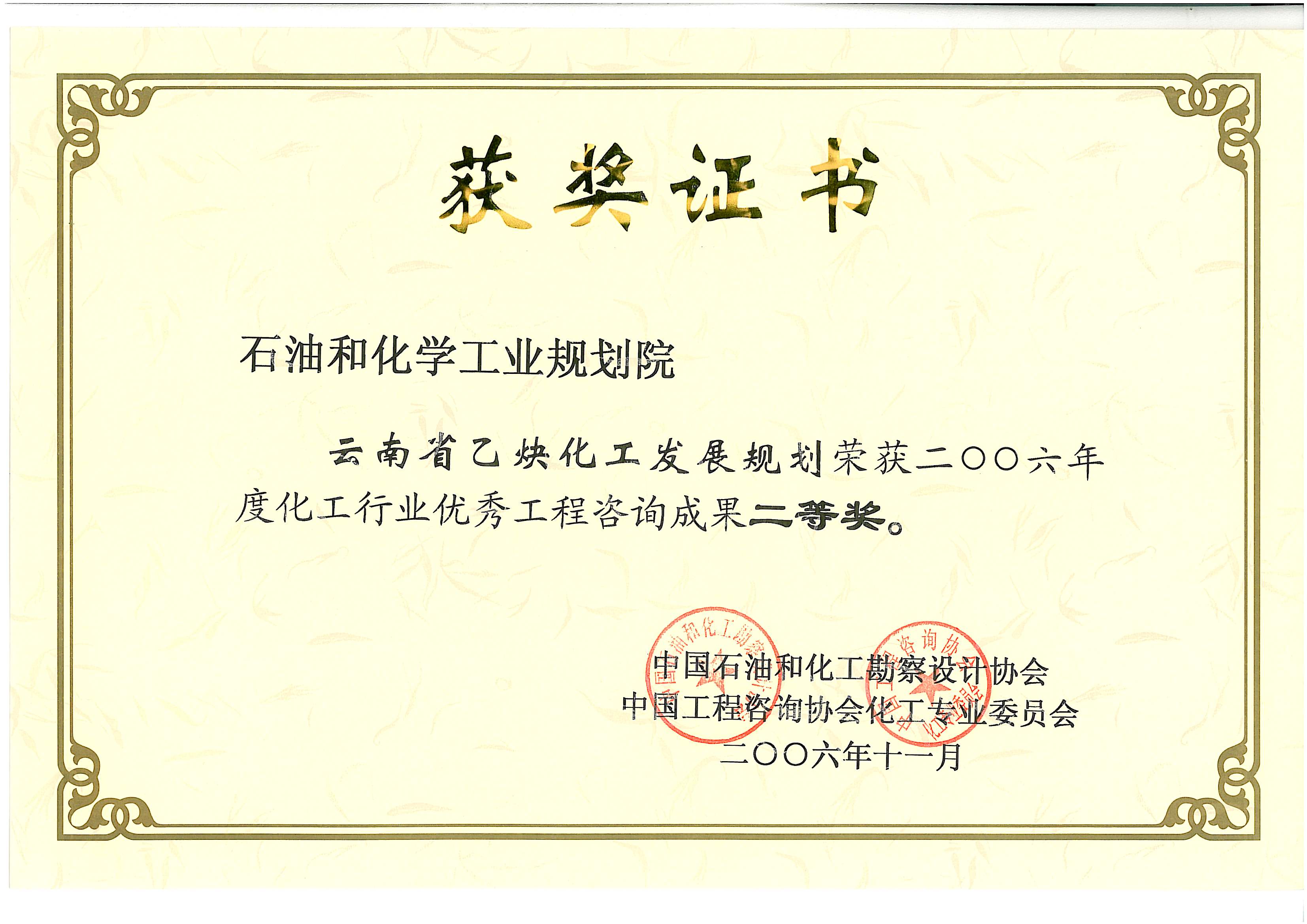化工行業優秀工程咨詢成果二等獎(云南乙炔)